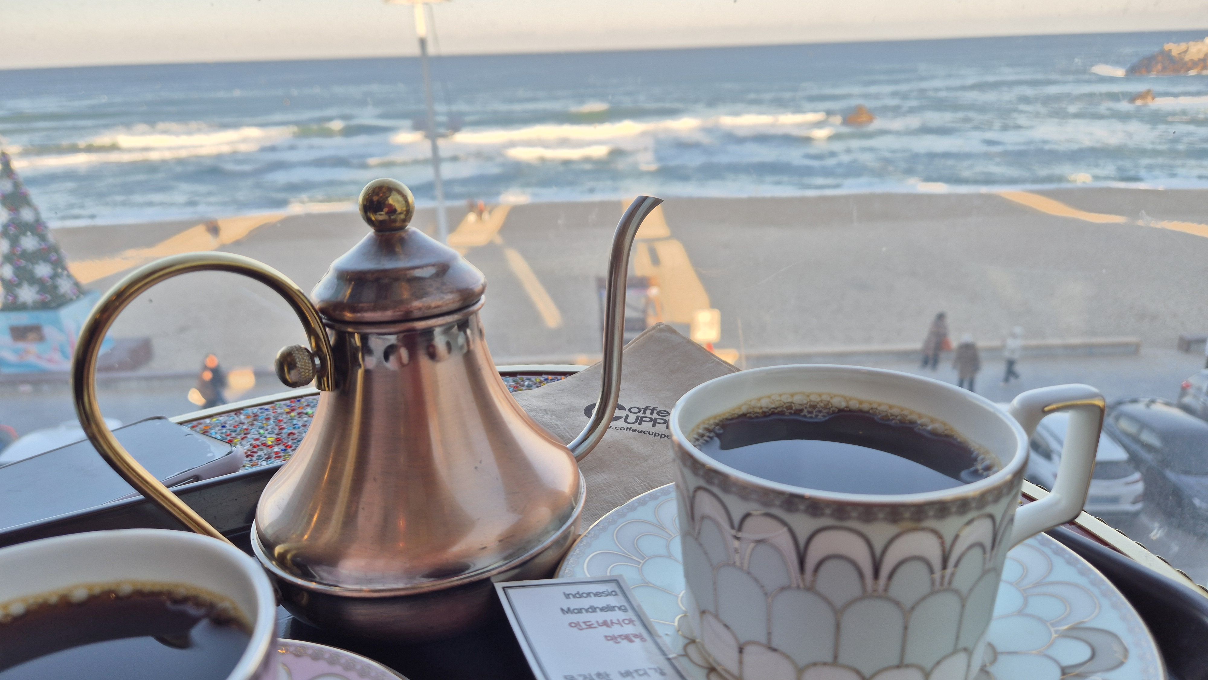 커피 한 잔과 여유로운 바다 전망은 여행의 피로를 풀어주며,