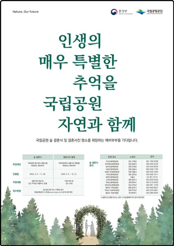 결혼을 앞둔 예비부부라면 아름다운 자연 속에서 의미 있는 결혼식을 올리고 싶을 것입니다. 국립공원공단에서는 자연 친화적인 결혼식을 희망하는 예비부부를 위해 무료 숲 결혼식 프로그램을 운영합니다. 웨딩 촬영만 원하는 커플도 신청할 수 있어 더욱 특별한 순간을 남길 수 있습니다.