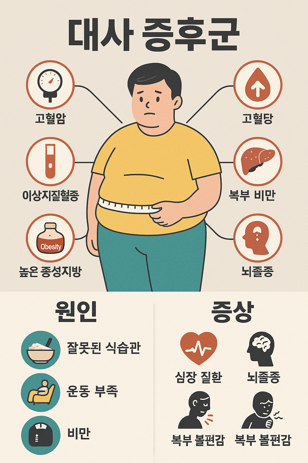 대사 증후군은 복부비만, 고혈압, 고혈당, 고중성지방, 낮은 HDL 콜레스테롤 중 3가지 이상이 동시에 나타나는 상태를 말합니다. 당뇨, 심장병, 뇌졸중 위험을 높이는 전조 신호로 간주됩니다.