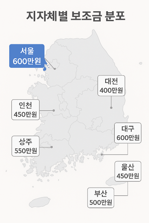 서울, 부산, 대구 등 주요 광역시는 평균 300만~600만 원의 추가 보조금을 지급합니다. 예를 들어, 서울시 기준 최대 600만 원이 추가되어 국비+지방비 총 1,200만 원 이상 혜택을 받을 수 있습니다. 각 지자체별 예산 소진 시 조기 마감되므로 사전 확인이 필수입니다.