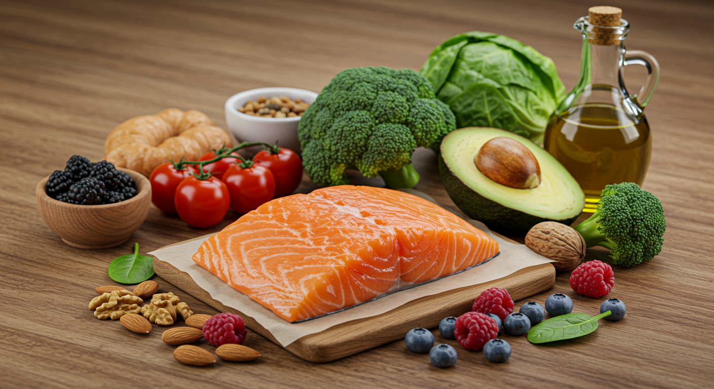 - 식단 리셋: 채소·과일·통곡·견과·생선(오메가3) ↑ / 가공육·정제당·트랜스지방 ↓