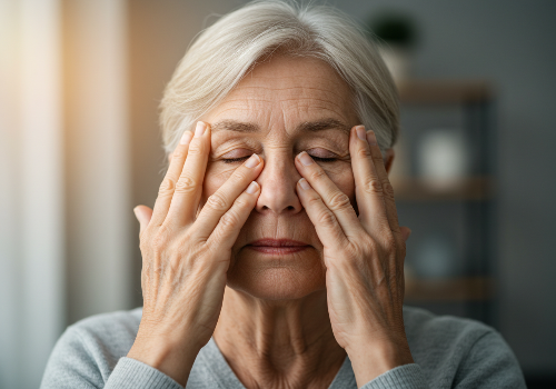- 눈썹 뼈, 코 옆, 관자놀이 부위 등을 손가락으로 부드럽게 눌러 마사지합니다.