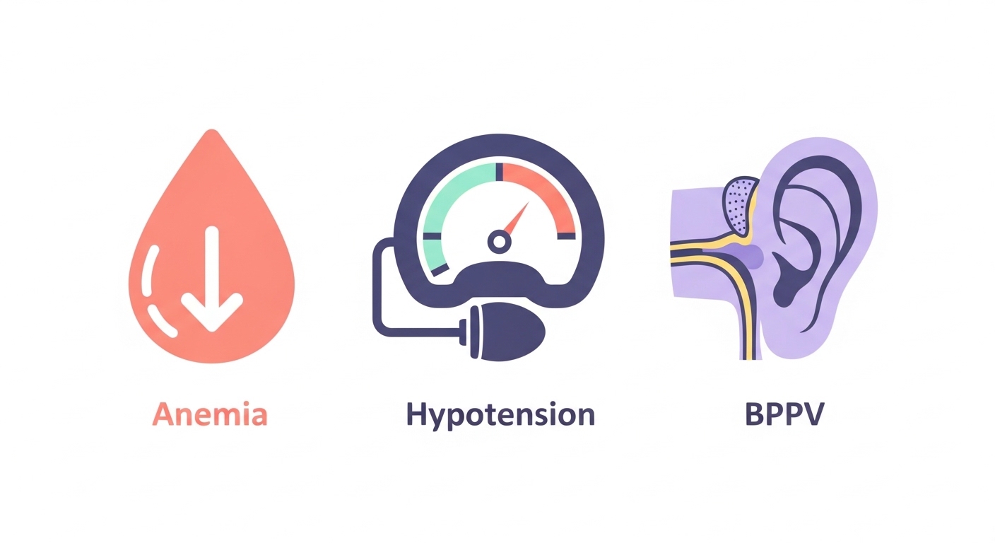 | 주요 원인 | 철분 부족, 생리과다 | 탈수, 약물, 자율신경 문제 | 귀 안 이석 이탈 |