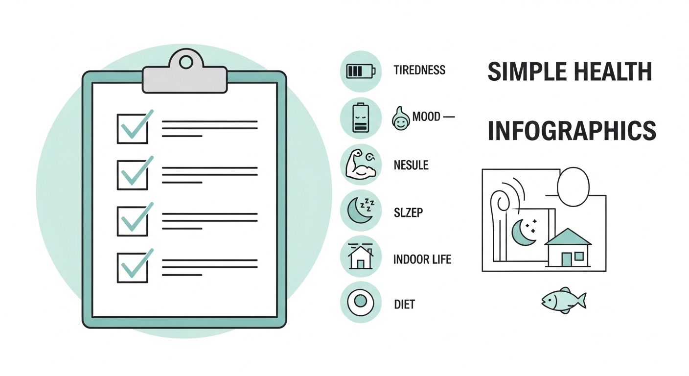 다만 비슷한 증상은 수면 부족, 스트레스, 식사 습관 등 여러 이유로도 생길 수 있어요. 그래서 오늘은 겁주기 없이, 비타민D 부족 증상을 “집에서 점검하고 생활로 관리하는 방법”을 정리해볼게요.