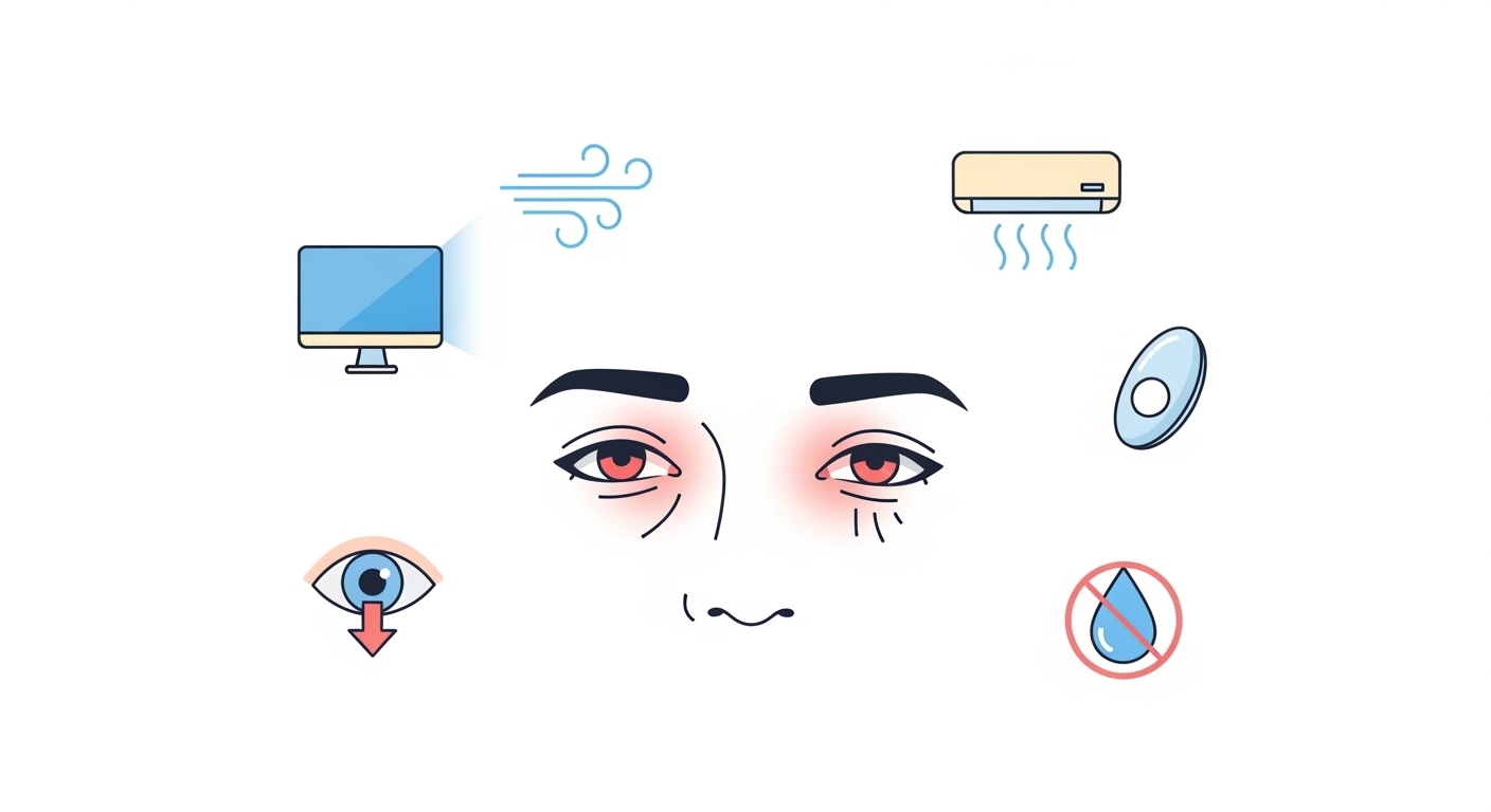 눈이 따갑고 건조한 이유는 장시간 스크린 사용, 에어컨·난방, 렌즈 착용, 눈물 분비 감소, 미세먼지 등입니다. 20-20-20 규칙, 인공눈물, 가습기, 렌즈 착용 시간 줄이기, 의식적으로 눈 깜빡이기로 안구건조증을 관리할 수 있습니다.