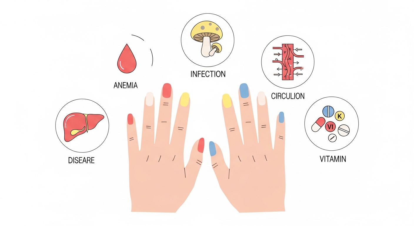 손톱 색 변화 원인은 빈혈, 곰팡이 감염, 간 질환, 혈액순환 장애, 흑색종 등입니다. 창백하면 빈혈, 노랗고 두꺼우면 곰팡이, 검은 줄은 흑색종 가능성이 있습니다. 철분 섭취, 손톱 청결, 보습, 비타민 섭취로 손톱 건강을 관리할 수 있습니다.