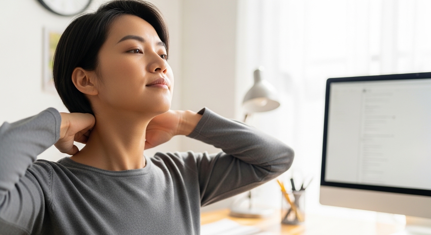 책상에 오래 앉아 있으면 목 근육이 굳어집니다. 1시간 이상 움직이지 않으면 뻐근함이 심해집니다.